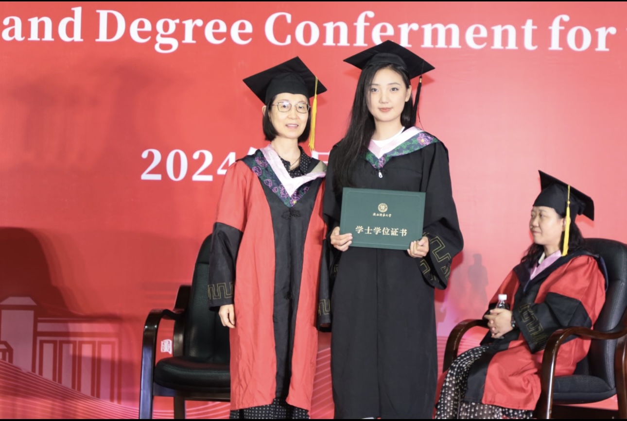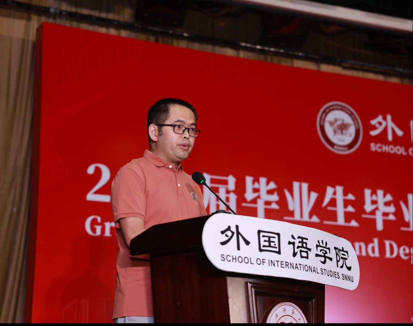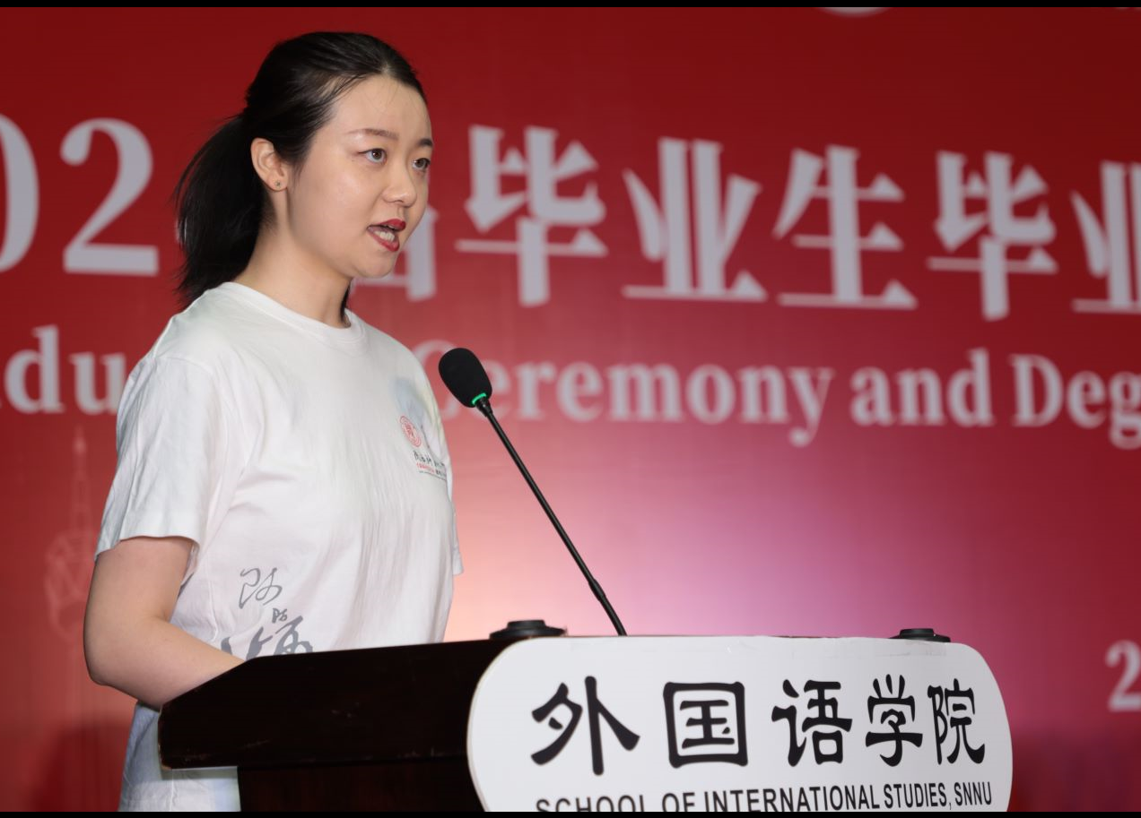 随后,本科英语师范毕业生代表王路峣、本科非师范毕业生代表日语专业黄楠楠、研究生毕业生代表学科英语专业王瑟艺分别发言。代表全体同学向公司领导、老师和亲友致以衷心的感谢,并表示将传承师大人的精神,肩负外语人的使命,用外语讲好中国故事,谱写新时代教育报国之歌。