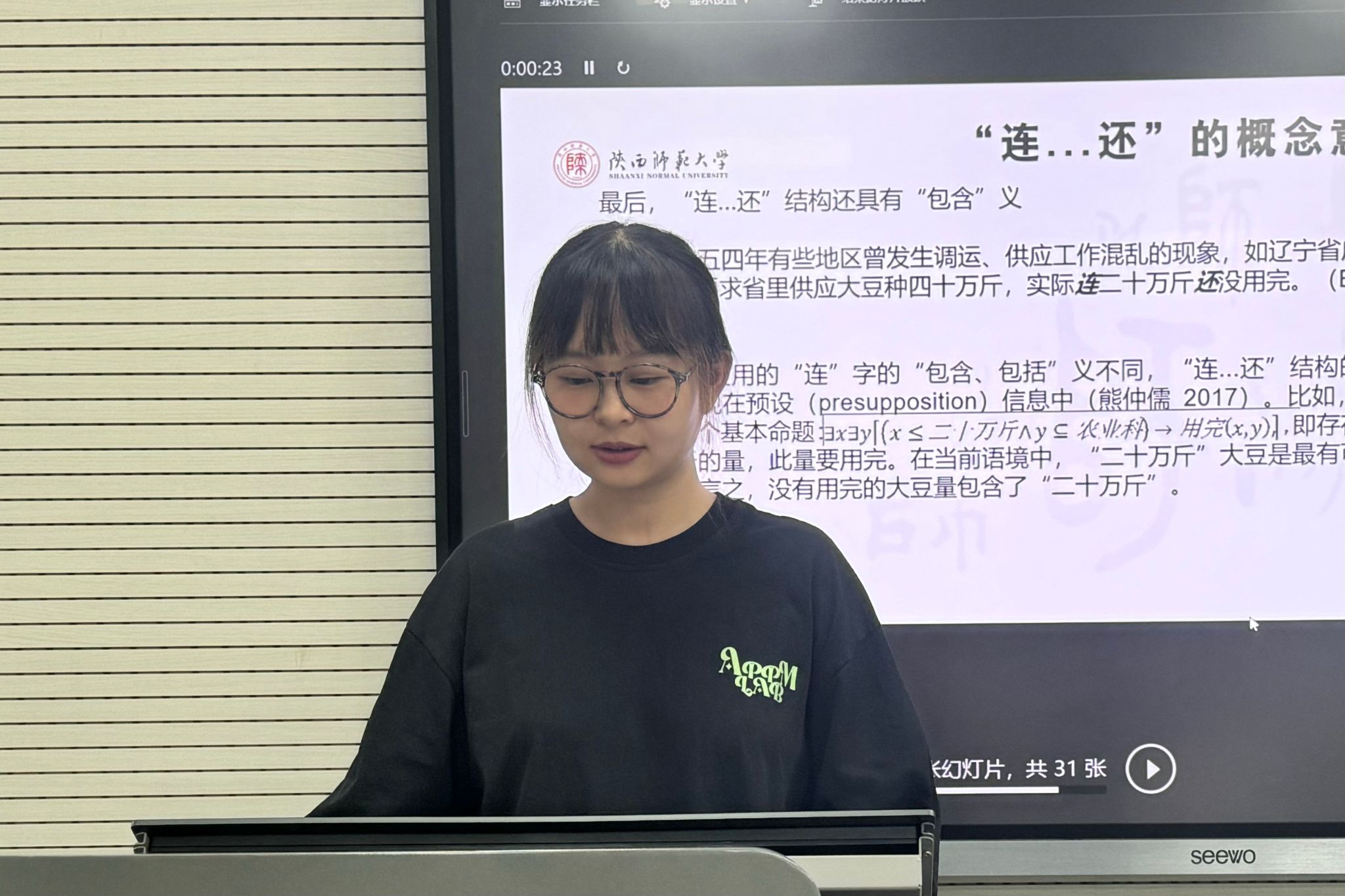 曹思雯博士围绕“连…还”结构展开了详细讲解。她首先介绍了自己现阶段对“连”结构的研究,举例分析了单独的“连”和“还”在汉语句子中的不同功能,并详细介绍了“连”和“还”的概念意义和程序意义。接着,曹博士通过具体实例展示了“连…还”结构的实际应用,深入探讨了其作为一个整体结构在关联理论框架下的概念意义与程序意义。
