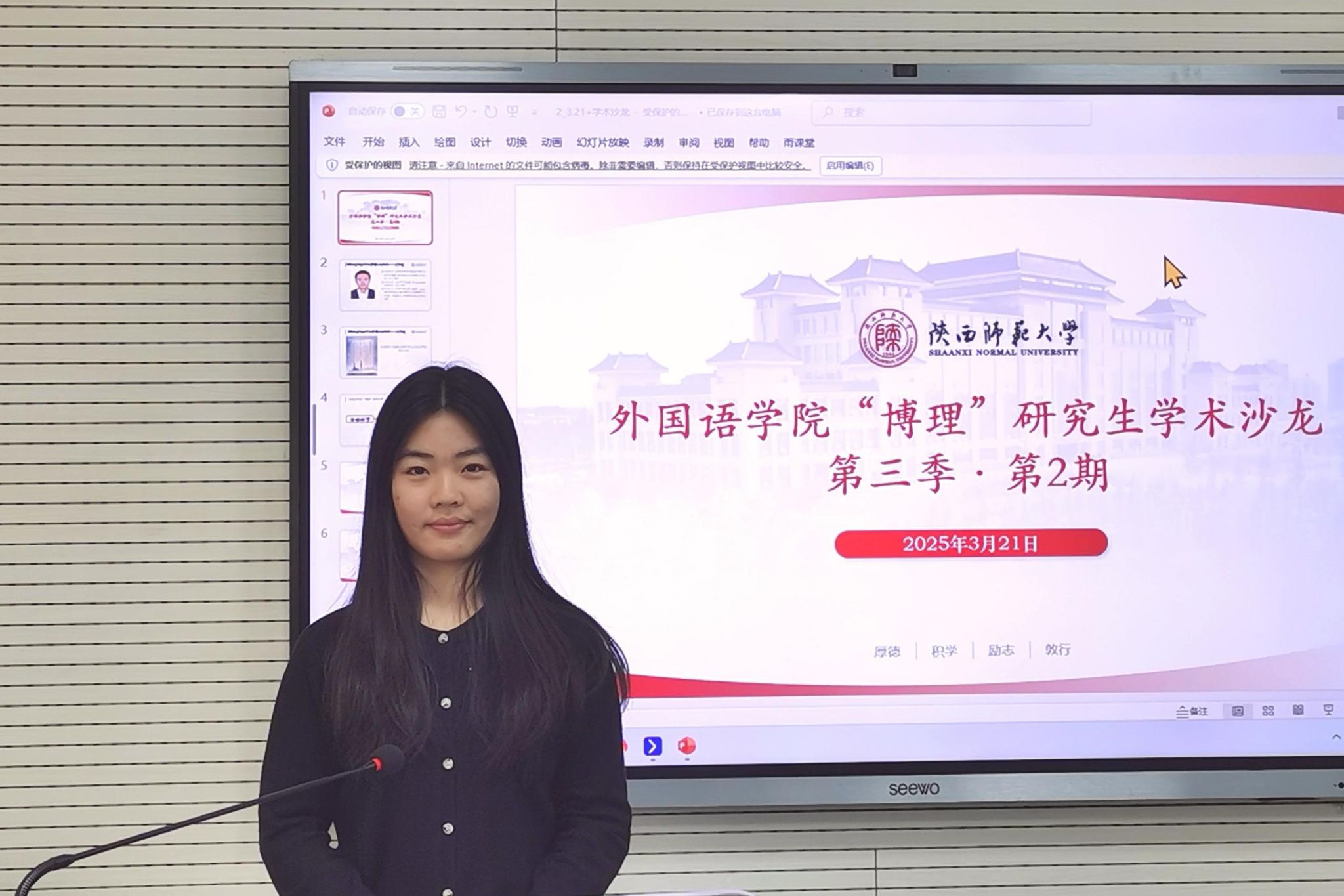 为营造浓厚的学术氛围,加强研究生间的学术交流,3月21日下午15:00,3044永利集团“博理”研究生学术沙龙第三季第2期在雁塔校区教学六楼6323教室举办。本次学术沙龙邀请公司2021级翻译学博士研究生丁礼明分享专题报告,2024级英语笔译硕士研究生吴佳冉担任主持。研究生辅导员董洁出席本次沙龙。