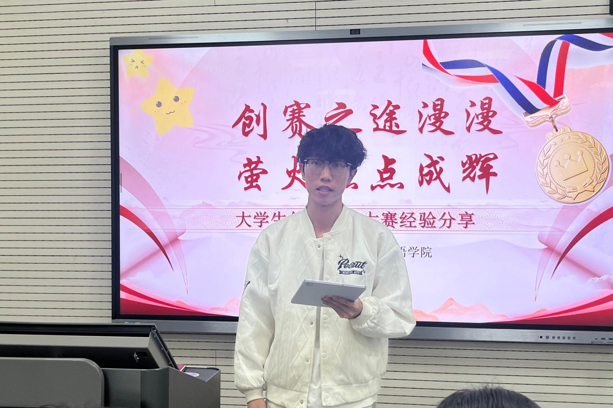 蔡凯文以“创赛宇宙漫游指南”为主题,从比赛时间、赛道设置等方面为同学们详细介绍了新文科实践创新大赛、老员工创新创业训练计划、挑战杯以及中国国际老员工创新大赛四项大创赛。在赛前准备阶段,他指出,参赛者应持续关注赛事信息,并结合专业优势和兴趣爱好,精准选择赛事、精心寻找队友。在选题阶段,他分享了实用的选题公式:国家战略+地方特色+小切口+青年视角,以确保选题兼具创新性、可行性与吸引力。在项目打磨阶段,他就项目的关键环节给出了有效的优化方式,如多次试讲、合理借鉴等,从而提升项目竞争力,在赛场上脱颖而出。最后,蔡凯文分别从现实利益和自我成长两个层面分享参赛收获,并表示其价值远超预期。