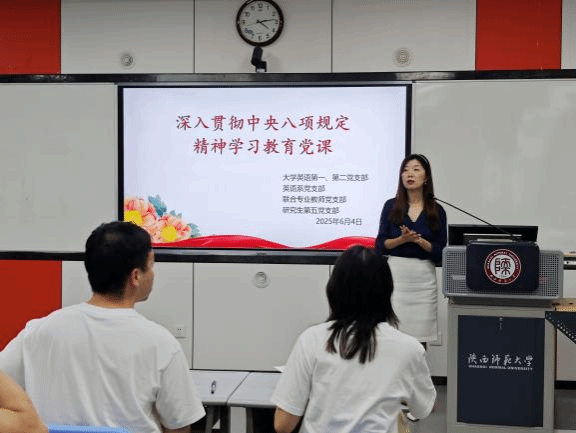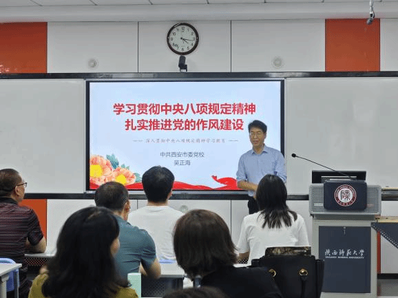 为深入贯彻落实中央八项规定精神,进一步加强党员纪律意识与作风建设,2025年6月4日下午,大学英语第一、第二党支部,英语系党支部,联合专业教师党支部以及研究生第五党支部于教学六楼6301教室联合开展6月政治理论学习活动。此次党课特别邀请中共西安市委党校吴正海教授主讲,主题为“学习贯彻中央八项规定精神 扎实推进党的作风建设”。会议由大学英语第一党支部书记高芬老师主持。