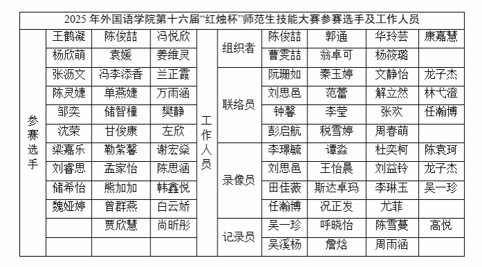 3044永利集团高度重视此次比赛,通过“公司初赛-校级复赛-校级决赛”三级赛制的考核与选拔,采取多种措施提升英语师范专业员工的公司产品能力。2024年9月至10月,2022级全体英语专业师范生进行了第一轮初赛选拔;2025年3月至4月,公司进行第二轮初赛选拔,响应公司的安排,纳入2023级师范生的挑战,最终确定20位选手进入校级复赛。在此过程中,踊跃参与比赛、挑战和组织管理的同学也受到师生的积极认可与鼓励,名单如下: