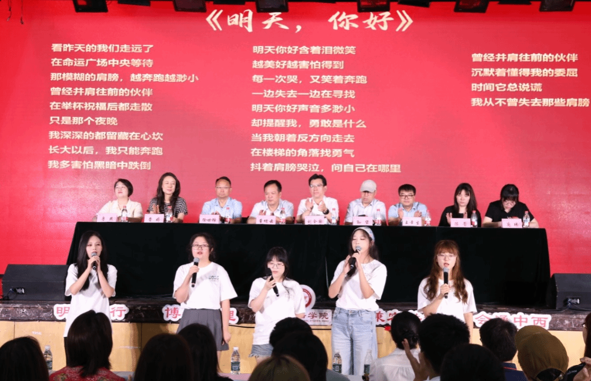 最后,2025届英语自费师范专业丛雨昆同学带领全体毕业生进行毕业宣誓。2025届毕业生徐璠、李惠琳、陶瑞雯、闫雨晴、王梅同学带领师生合唱《明天,你好》,毕业生们热泪盈眶、挥手作别。