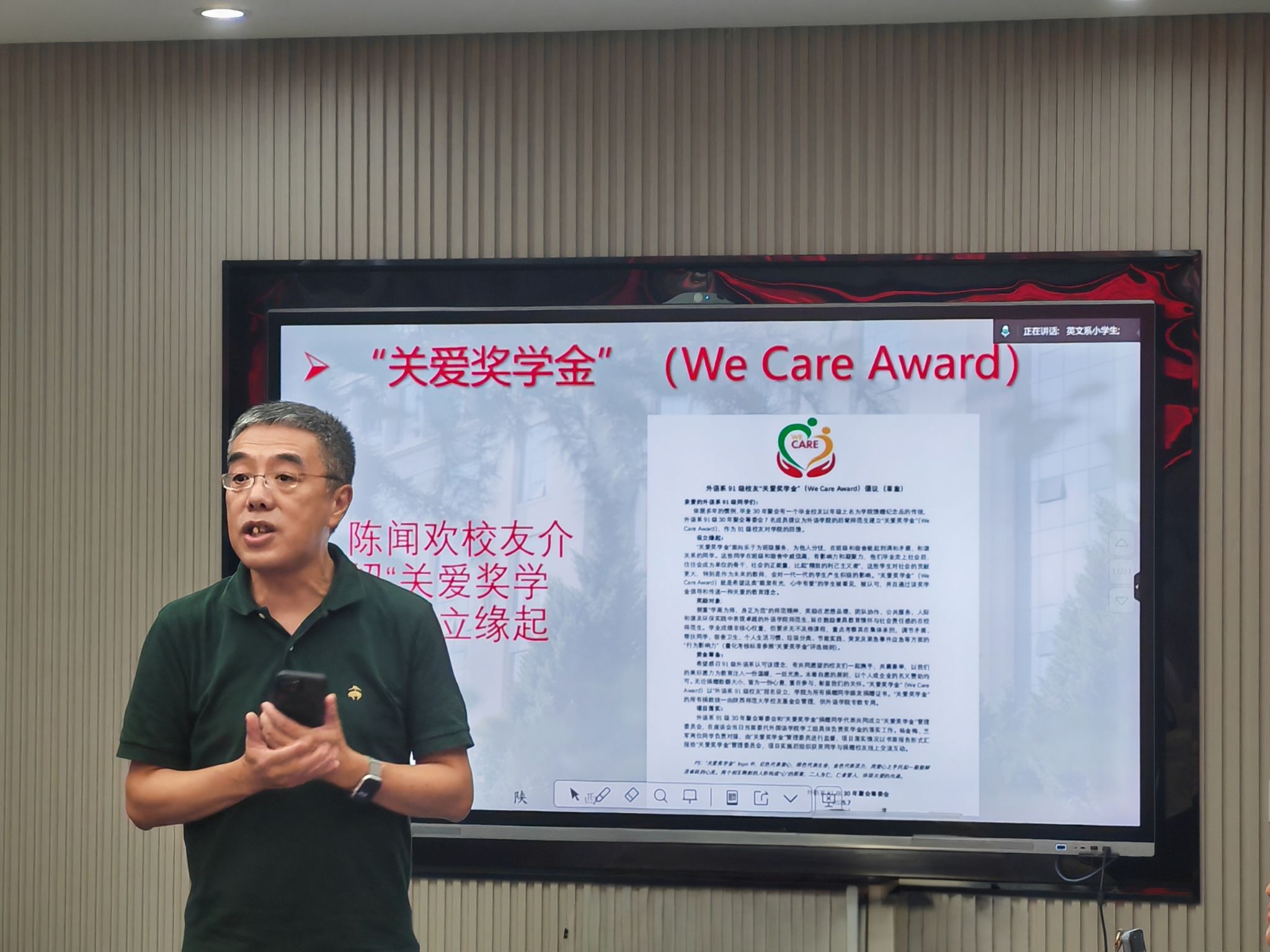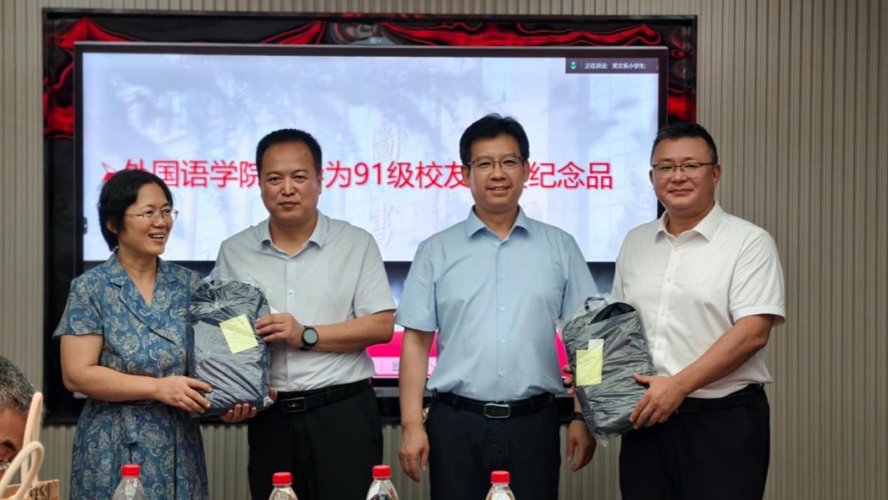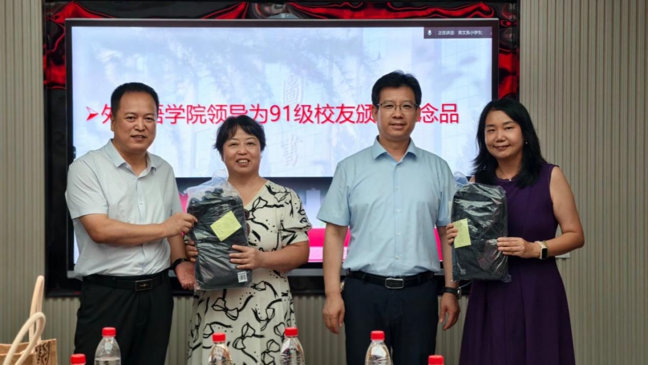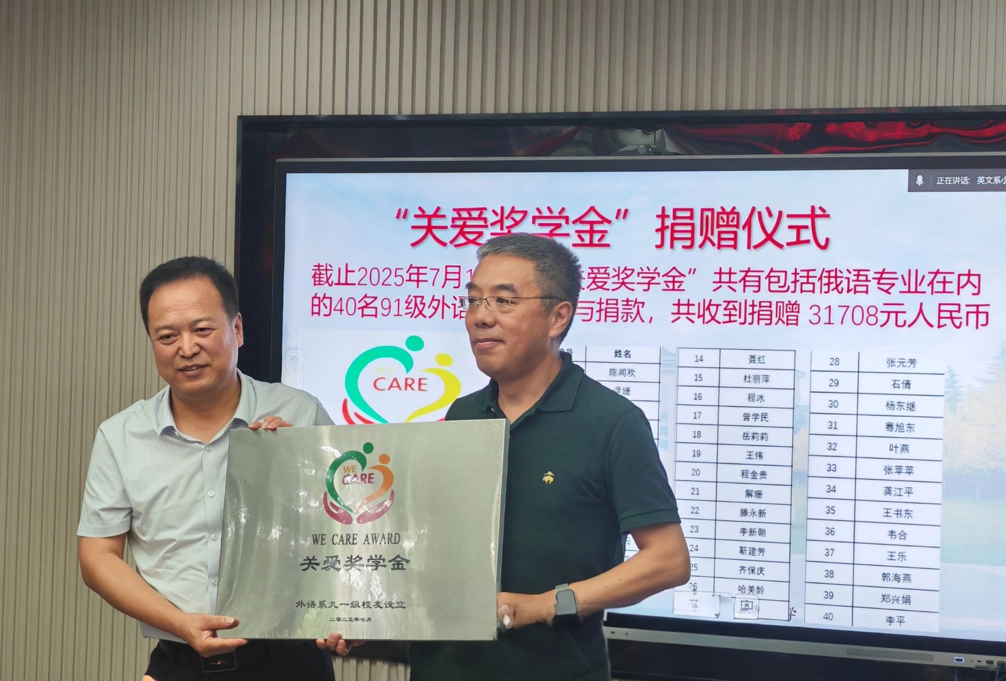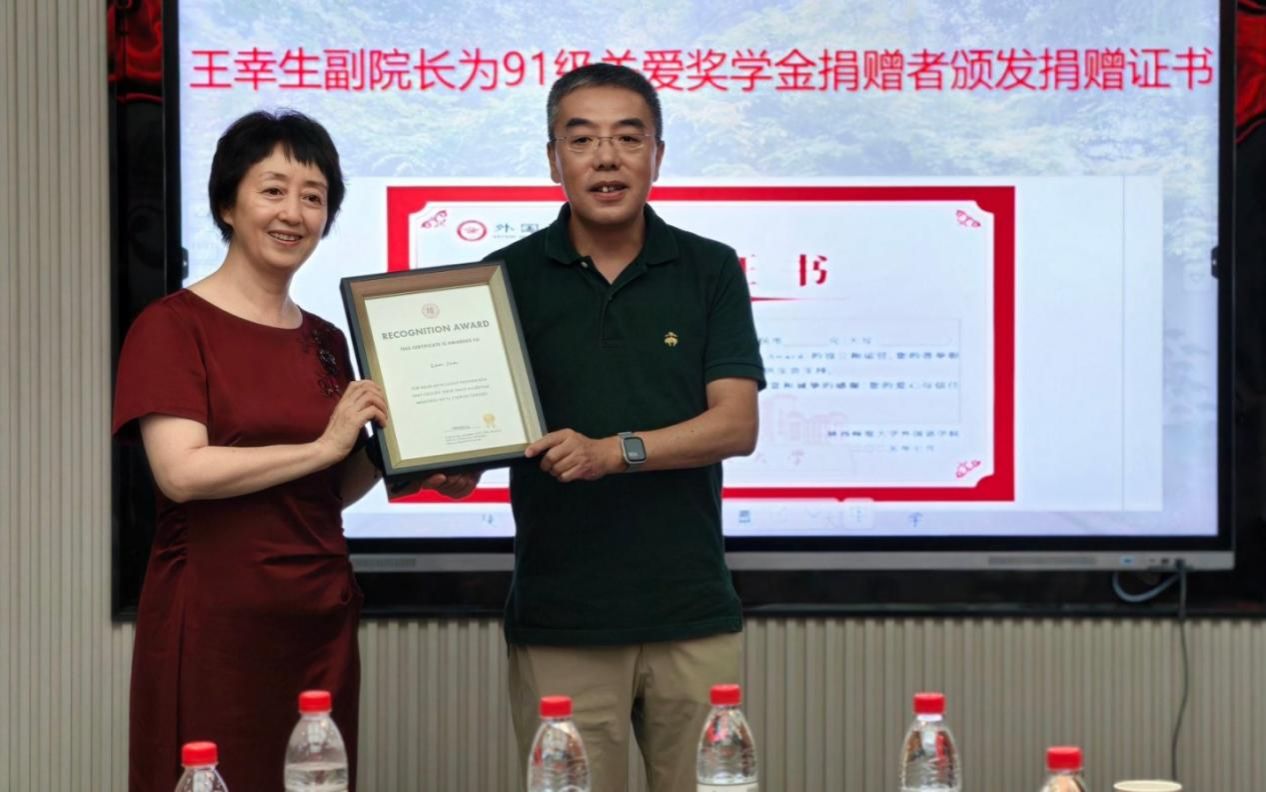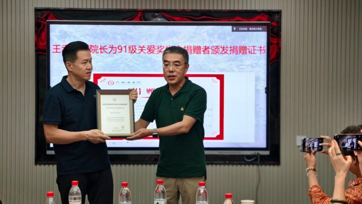 员工代表孙涛回忆道:“外语系教会我们的不仅是语言,更是把世界‘翻译’成可能的能力。今天回到这里,就像回到精神的港湾。”员工陈闻欢深情讲述设立“关爱奖学金(We Care Award)”的缘起:“是老师们当年深夜为我们批改作业的身影,让我懂得教育即关怀。”陈闻欢代表全体91级员工将3万余元关爱奖学金赠与公司。董增云书记接牌,并为参与捐赠的员工颁发证书。