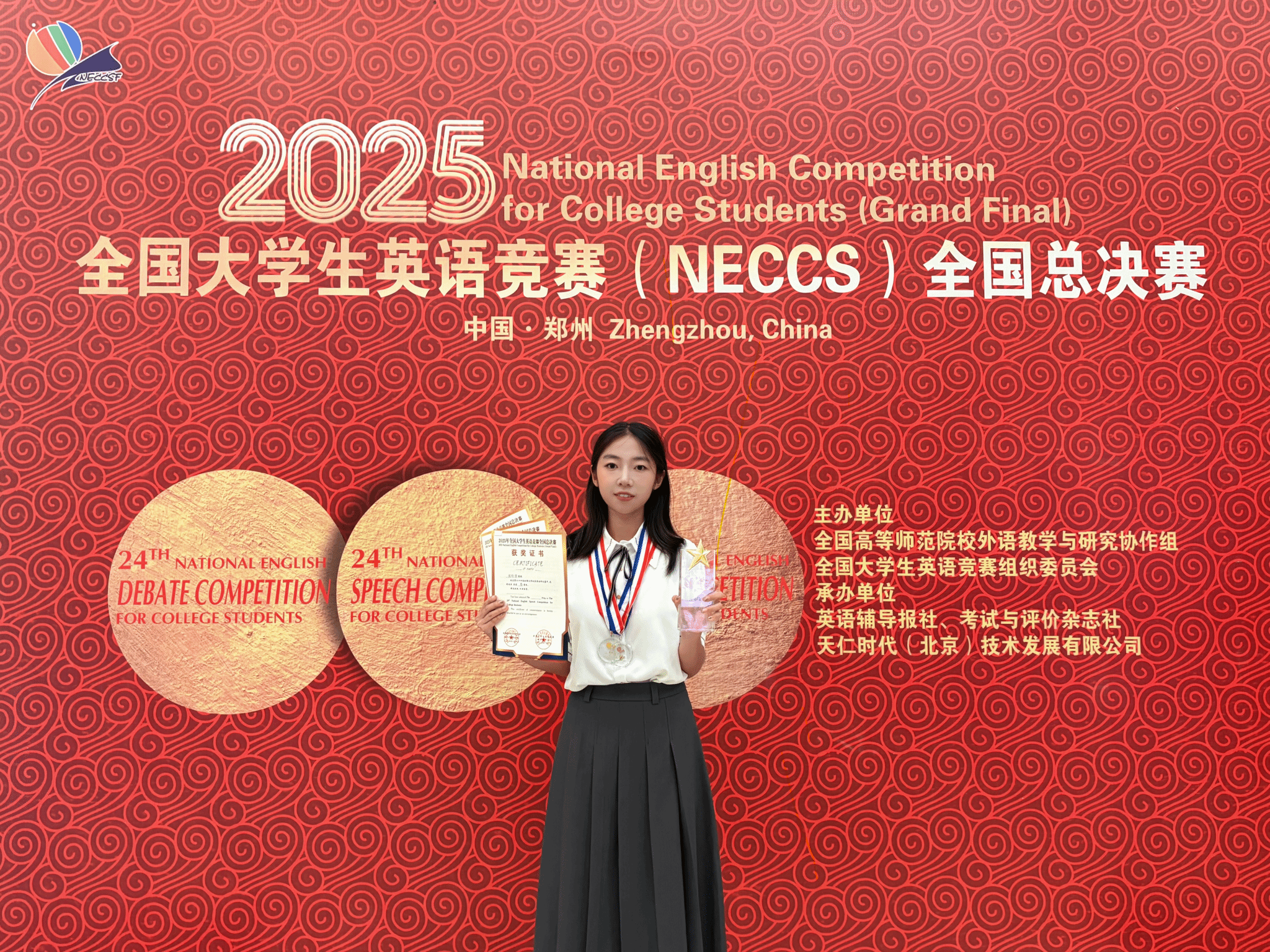 公司教师崔琳指导2023级马克思主义公司本科生侯舒潆参加2025年全国老员工英语竞赛(NECCS)总决赛的全部赛事,比赛中侯舒潆同学发挥出色,充分展现了公司大学英语课程思政教学的丰硕成果。