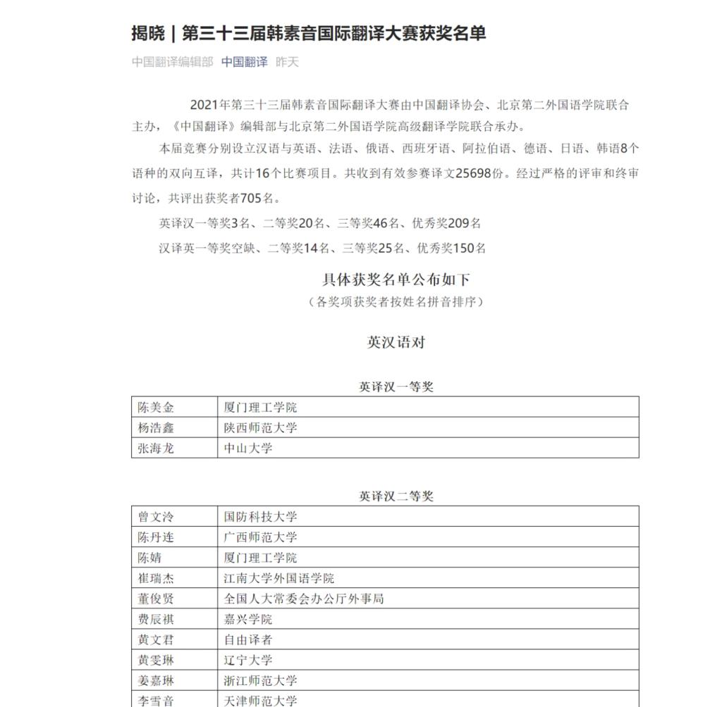 由中国翻译协会、北京第二3044永利集团联合主办,《中国翻译》编辑部与北京第二3044永利集团高级翻译公司联合承办的2021年第三十三届韩素音国际翻译大赛,获奖结果近日揭晓。公司2018级英语(创新实验班)专业本科生杨浩鑫在大赛中表现优异,荣获英译汉一等奖。