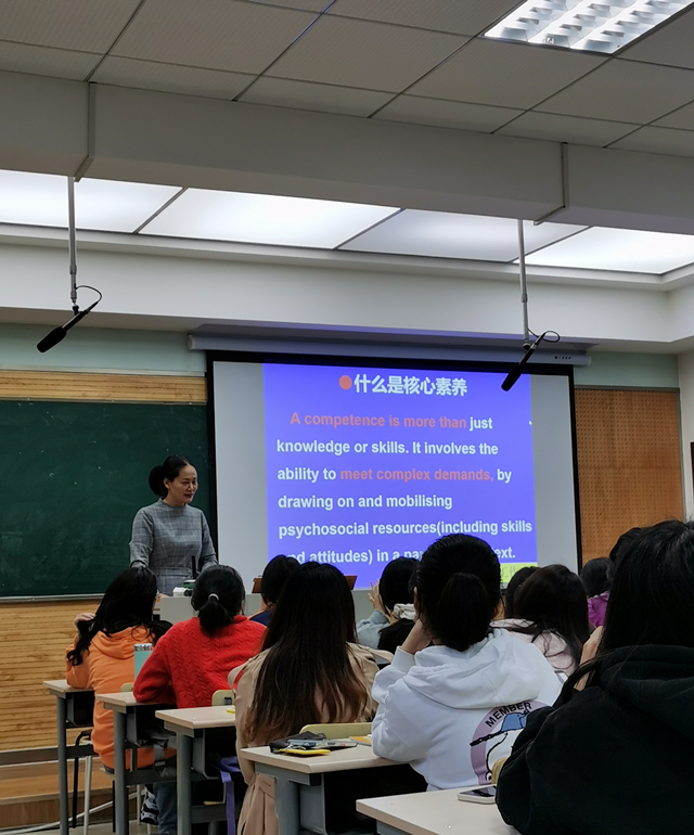 讲座伊始,房老师以提问的方式激发全体同学的思考,进而引出高中英语课程标准的要求与核心词:主题、语篇、核心素养和学习活动观,并为同学们逐一解读每个核心词在英语教学中的含义以及所涉及的分支。 随后,房老师以自己的一篇教学设计向全体同学展示她是如何在备课过程中根据新课标要求设计教学环节和教学活动的,将教学内容转化为对员工的核心素养的培养,这对现场的同学们今后的教学实践具有现实启发意义。