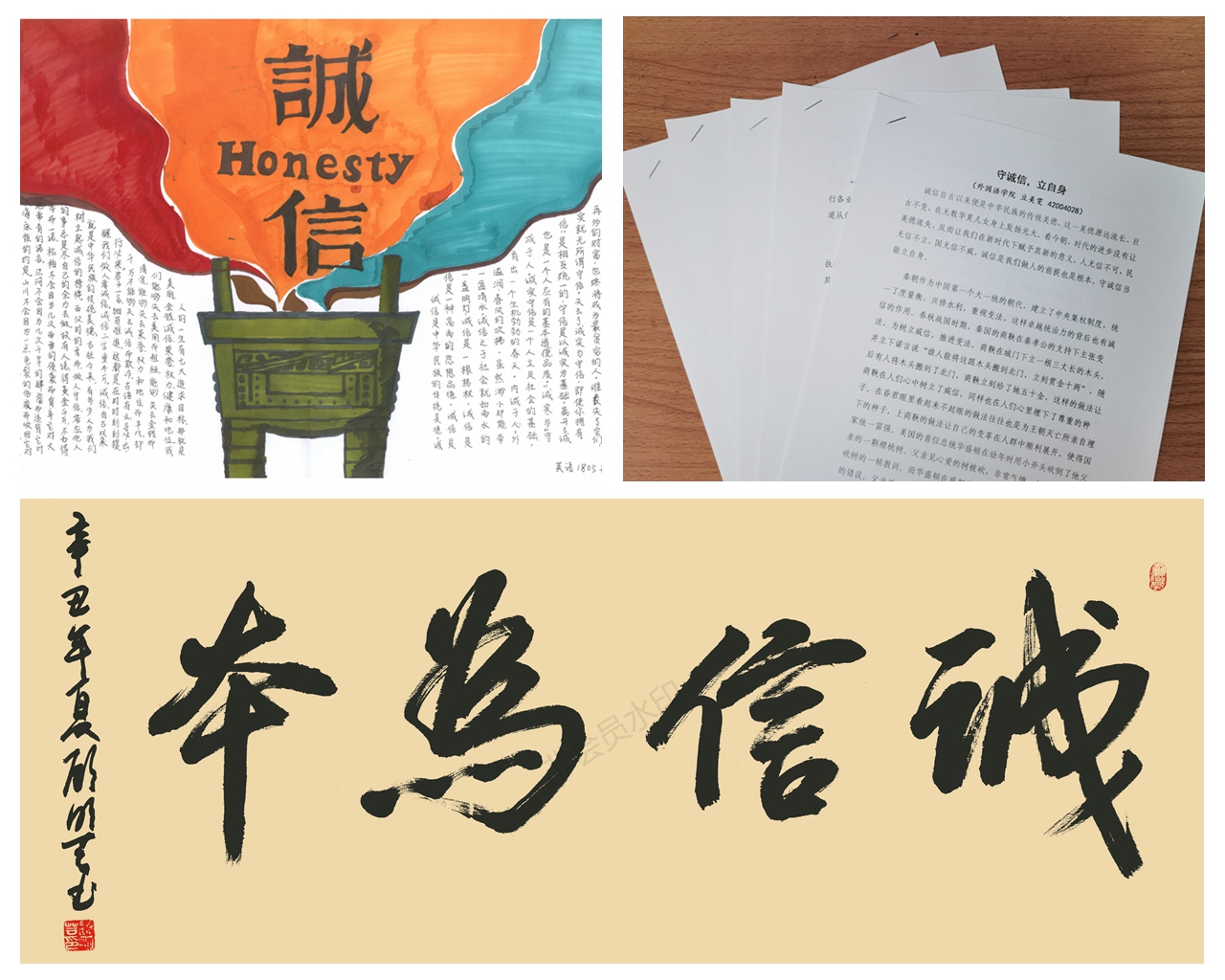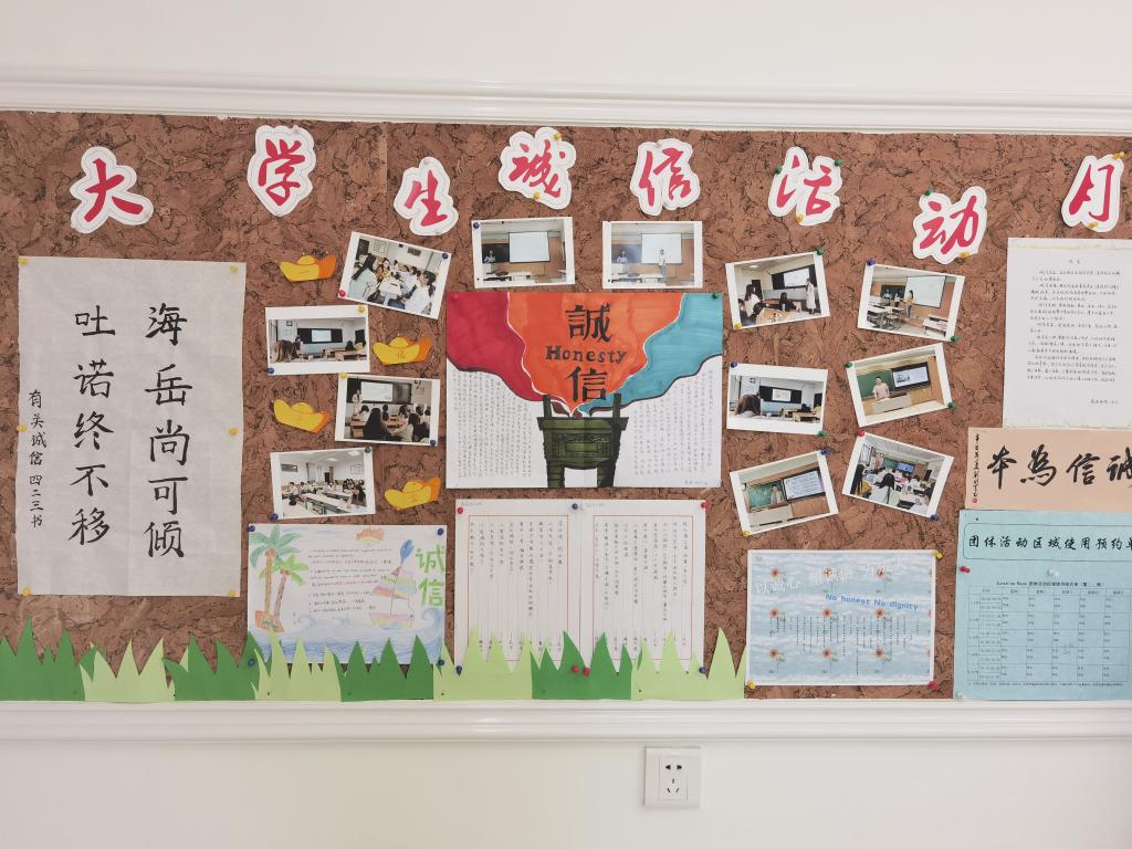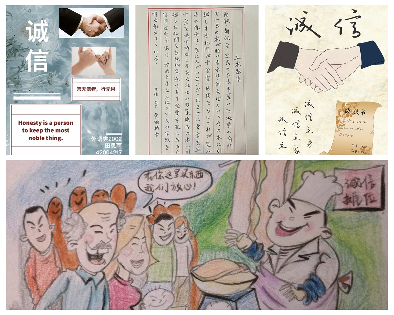 结合同学们的专业优势和个人特长,3044永利集团面向全体本科生举办诚信主题作品征集活动,拍摄微视频《诚信》讲述校园中“拾金不昧”的诚信故事——经过筛选评比,最终遴选出优秀诚信主题征文5篇,书法作品7件,手抄报绘画作品6件,主题微视频短剧1部。征文作品字里行间体现出同学们对于诚信的崇尚与呼吁,硬笔书法刚劲有力,绘画海报生动形象,短剧视频见微知著。相关优秀主题作品还在公司“语心阁”宣传展板进行展览,吸引了众多员工们前来观看。公司也通过“外院见闻”官方微信,进一步对于诚信教育优秀主题作品进行宣传展示。