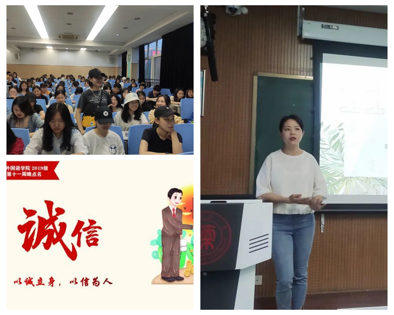 2019级第11周晚点名于5月9日19:30在教学四楼4301举行,本次主题晚点名以“诚信”为题,辅导员屈婉婷老师解读诚信的深刻内涵的,讲解“立木为信、烽火戏诸侯”等传统诚信故事,同学们回忆交流自己遇到的诚信经历,分享诚信成语背后的感人故事,人无信不可,民无信不立,国无信不威。通过引导同学们将“诚信”内化于心外化于行,“以诚立身,以信为人”在学习、工作和生活中,必须将“诚信”二字立于心头,躬身践行社会主义核心价值观,传承和弘扬诚实守信的美德,诚实待人、老实做事,勤奋刻苦,用勤劳的双手和真实的本领创造属于自己的辉煌。
