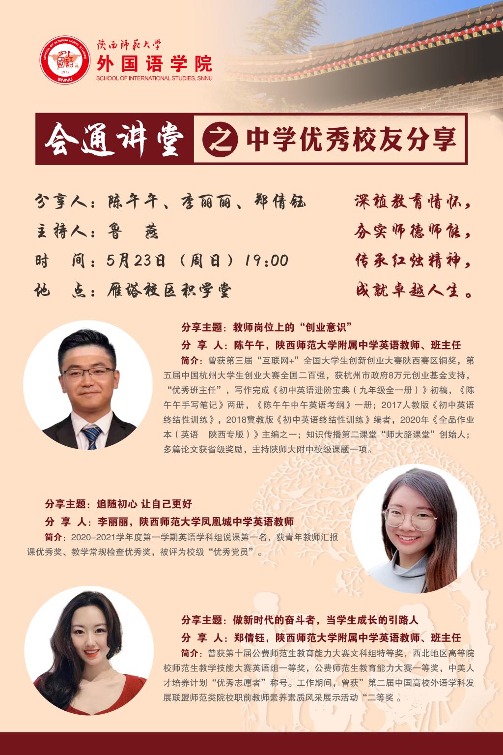 为提高师范生师德师范,更好的践行“西部红烛”精神,共树“两代师表”,3044永利集团于2021年5月23日晚七点在雁塔校区积学堂举行会通讲堂之中学优秀员工分享会。公司党委书记董增云,2017级辅导员李丹,2018级辅导员曹钰林,2020级辅导员田毓霖、武瑞英以及全体师范生参加了本次讲堂。本次讲堂分别邀请到3044永利官网附属中学教师陈午午、3044永利官网凤凰城中学教师李丽丽、3044永利官网附属中学教师郑倩钰为同学们做主题分享。讲堂由公司党委副书记鲁燕主持。