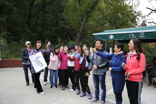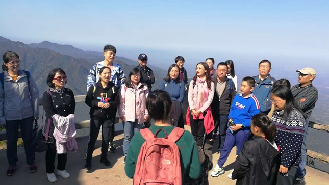 老师们组成三个登山小队,大家分别创建自己的队名、队歌和口号,一路互相帮助,欢歌笑语,用一首首正能量的歌曲自我激励,山路虽然陡峭,但大家基本都登到了山顶。在山顶欣赏秋日美景,老师们一同唱起《我和我的祖国》,引起了众多游客的共鸣,大家高声歌唱,歌声在幽幽山谷飘荡。