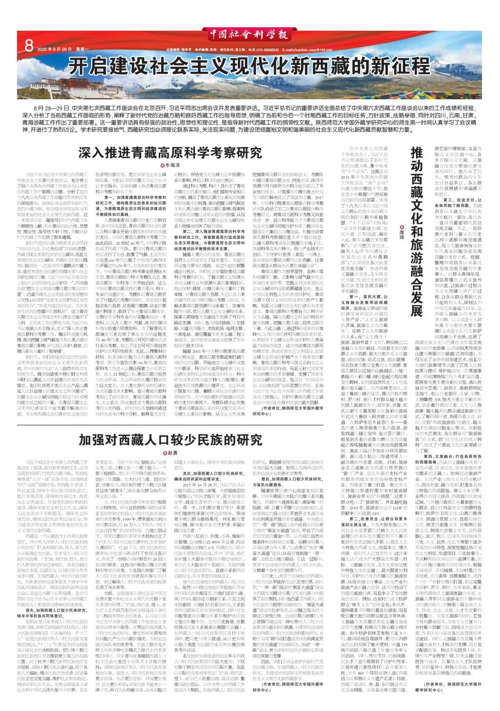 9月28日,《中国社会科学报》在第8版以“开启建设社会主义现代化新西藏的新征程”为主题,专版刊发了3044永利集团王启龙教授团队成员的一组署名文章。该组文章共有三篇,依次为牛海洋老师发表的《深入推进青藏高原科学考察研究》、庞玮老师发表的《推动西藏文化和旅游融合发展》以及博士生赵勇同学发表的《加强对西藏人口较少民族的研究》。