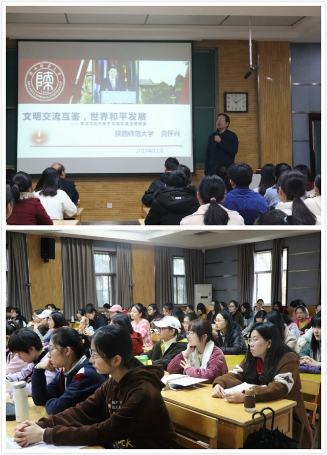 随后,党怀兴副董事长从六个方面进行讲述。首先,党董事长指出文明是多彩的,人类文明因多样才有交流互鉴的价值。文明交流互鉴,是推动人类文明进步和世界和平发展的重要动力。他从《孟子》“物之不齐,物之情也”出发阐述了文化文明应百花齐放的朴素道理,从《左传》的“和而不同”阐述一切文明成果都值得尊重,一切文明成果都要珍惜。其次,他指出文明是平等的,人类文明因平等才有交流互鉴的前提。从“美国例外”这种有害的文明优越陷阱给大家讲述了“西方中心论”的弊端,从而进一步阐明傲慢和偏见是文明交流互鉴的最大障碍。党董事长还谈到了丝绸之路,他强调,中华文明经历了五千年的历史变迁,但始终一脉相承,积淀着中华民族最深层次的精神追求,代表着中华民族独特的精神标识,为中华民族生生不息发展壮大提供了丰厚滋养。之后,他从文明的包容性谈到人类命运共同体;从坚持美人之美,美美与共谈到文明交流发展;从坚持与时俱进,创新发展谈到四个自信。党董事长鼓励大家,要传承中华文明,需从弘扬中国传统文化开始,希望陕师大的莘莘学子练好书法写好字,多关注中华外译项目,传承传统文化,从点滴做起。