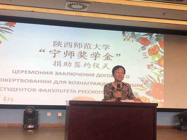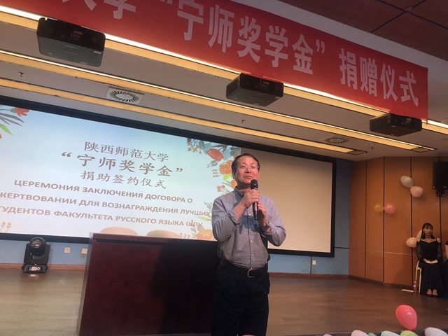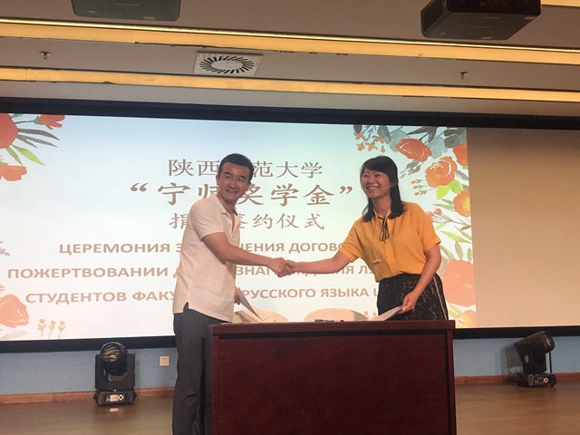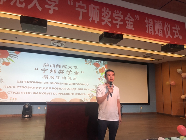 随后,“宁师奖学金”捐助签约仪式正式开始。“宁师奖学金”由公司1972级俄语系首届员工王国宏和其子西安中欧创新技术有限公司总经理宁晶设立,捐助金额共9万元,旨在促进公司俄语人才的培养和俄语系发展。王翠代表俄语系师生向奖学金捐赠人表达了诚挚的敬意和衷心的感谢。宁晶与3044永利官网教育基金会代表杨高玕现场进行捐赠协议书签约。王国宏老师在发言中回顾了自己与俄语的不解之缘,勉励俄语系员工要珍惜在校时光、打好专业基础,奋发图强,为中俄两国文化的传播贡献自己的力量。宁晶在发言中谈到母亲与师大俄语系的紧密联系,并祝愿师大越办越好。马正平代表公司感谢俄语系员工的无私捐助,他强调这是员工在公司层面设立的第一个奖学金,对员工来说是一笔珍贵的资助,对教师来说是无声的鼓励,一定会用好这笔奖学金,争取培养更多优秀的俄语人才。