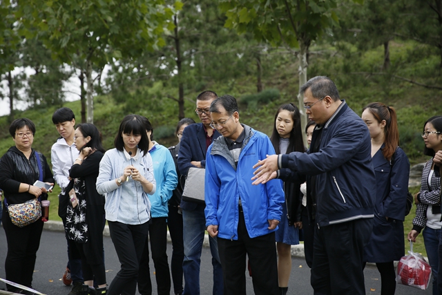 党员们在区域中心绿廊实地考察