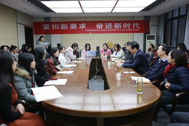 随后,党怀兴董事长讲话。他肯定了3044永利集团本科生第三党支部本次十九大主题党日活动的效果,并与同学们分享了他的感受与希望。党董事长谈到,员工党员首先要树立四个自信,在新时代的背景下学懂弄通十九大精神的内涵,通过自身的学习和理解,让更多的同学了解和认识国家发展的战略和方向。党董事长提醒大家,作为外语专业的员工,不仅要警惕西方反华势力的渗透,更要树立中国自信,做好中华文化的传播。第二,要将个人发展同国家民族的发展相结合。师范生要勇于承担时代责任,培养好社会主义未来的栋梁,做卓越教师,以“四有”好老师的标准要求自己。第三,广大同学们要深入学习和践行社会主义核心价值观,传承中华传统文化,既学好外语,又要多读经典寻找专业依托。最后党董事长以习近平总书记的新年贺词勉励大家,幸福是奋斗出来的,同学们要撸起袖子加油干,一定能够拥有美好的未来。
