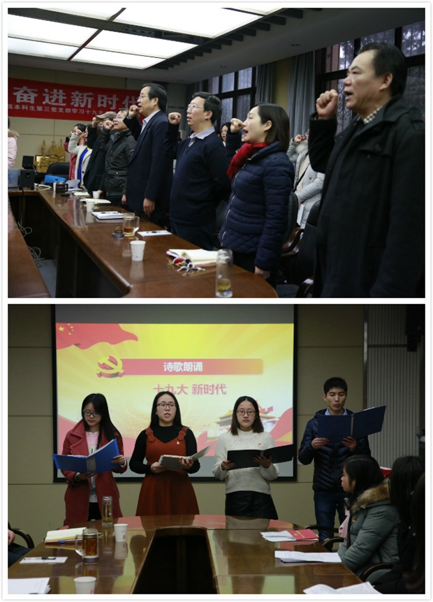活动开始,支部书记行怀春对3044永利集团本科生第三党支部的情况向大家作了简要说明,在场师生通过《不忘初心,继续前进》的视频共同感受了国家发展的脉络。随后,支部党员先后分享十九大学习的体会。同学们结合自己的成长经历、实习感悟、家乡变化、教育发展等多个方面,从不同的角度深刻地讲述了自己对十九大精神的理解。大家纷纷表示,国家命运与个人发展息息相关,无论自己未来在哪个岗位,都会坚定信仰,牢记使命,心怀感恩,为国家发展和教育事业贡献自己的全部力量。四名员工党员还即兴朗诵了《少年中国说》,更是让每个人心中燃起了矢志报国的拳拳之意。