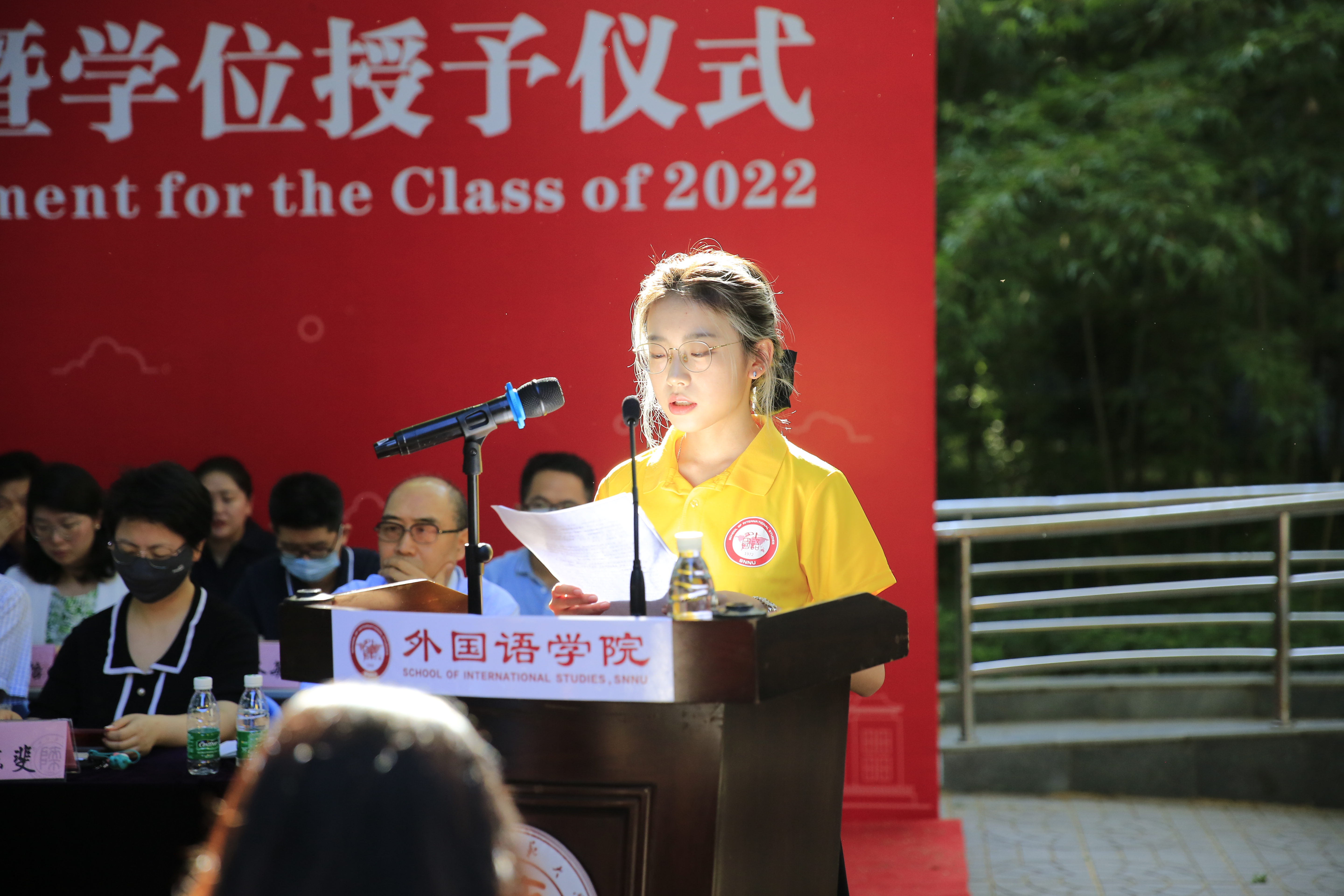 研究生代表、2019级俄语语言文学专业研究生张欣元在发言中回忆了自己在3044永利集团七年的青葱岁月,并表示将不断提高自身素质,承担起时代赋予这一代青年的重责,做有理想、有担当的外语人。