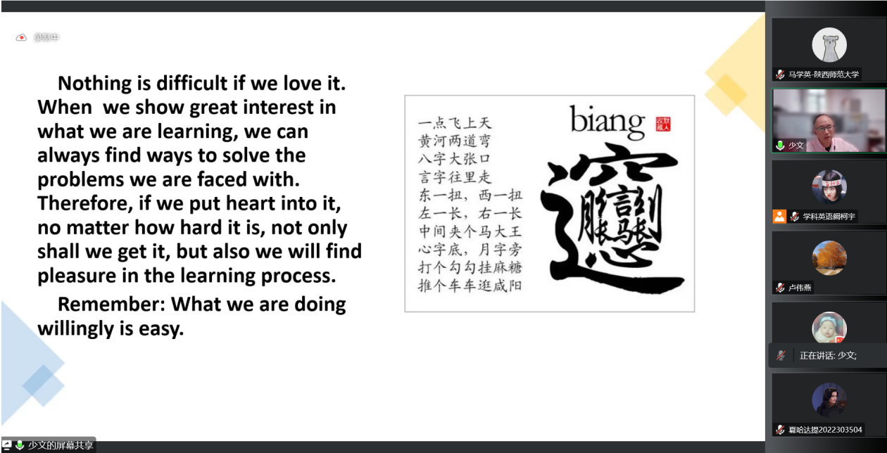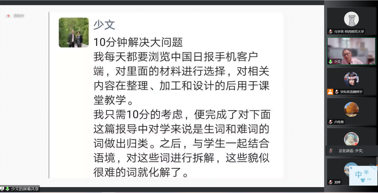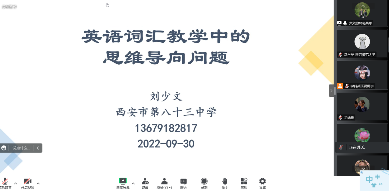 为了提高公司学科教学(英语)专业研究生的外语教学能力,加强员工对外语教学学科的理解,3044永利集团于9月30日下午在腾讯会议线上举行了基础教育外语教学专题研究系列讲座第七讲——英语词汇教学中的思维导向问题。本次讲座由西安市第八十三中学英语高级教师刘少文老师主讲,会议由韦理老师主持。2022级学科教学(英语)专业教育硕士聆听了讲座。