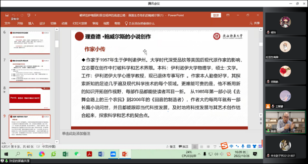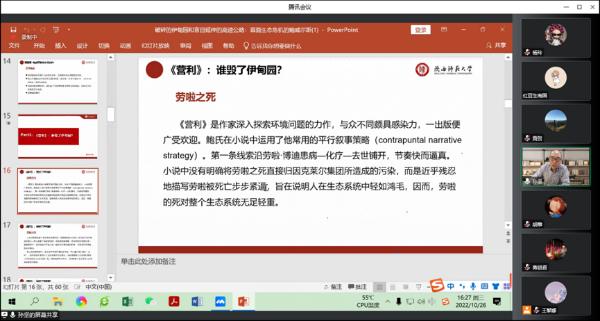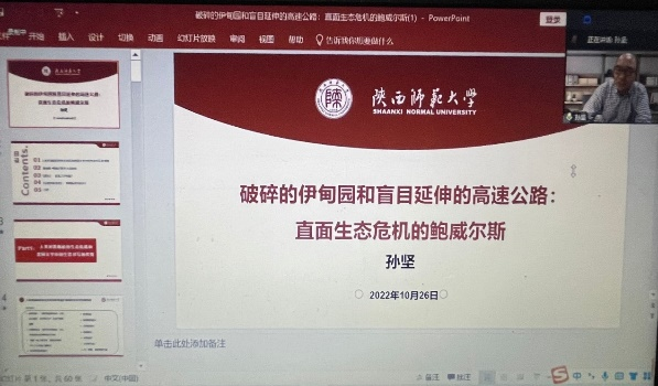 2022年10月26日,公司孙坚教授受邀参加中国人民大学公司举办的“教授论坛”系列讲座。讲座以“破碎的伊甸园和盲目延伸的高速公路:直面生态危机的鲍威尔斯”为题,由中国人民大学3044永利集团博士生导师陈世丹教授主持,采用腾讯会议形式线上进行。来自全国各地高校英美文学研究方向的数百名教师与研究生相聚云端,参加了本次讲座。