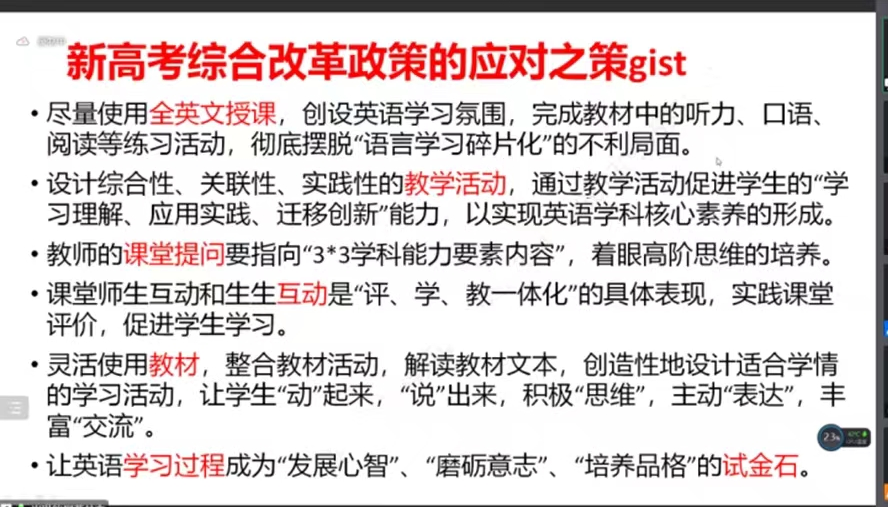 接着,崔老师从知识层面、认知层面、信念层面、实践层面和发展层面细致地讲述了很多英语学科十分核心的概念与知识,并就应对新高考政策提出了自己的建设性建议。最后,老师对同学们的疑问一一进行了解答。