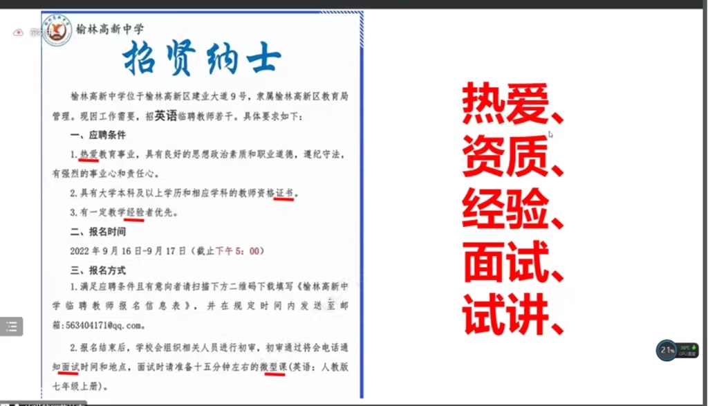 接着,崔老师通过简单的模拟中小学教师招聘面试,引导大家思考作为一名预备人民教师,我们应该具备哪些素质以及在面试过程中如何更好地表现自己。 崔老师讲到,作为一名英语教师,除了具备扎实的学识,还需要具有浓厚的教育情怀,明确自己的理想信念,热爱教育事业,积极奉献到教育事业与课堂中去。在教学中要做到以仁爱之心对待员工,积极主动了解员工,努力提高自己的核心素养,灵活运用各种教学方法,提高课堂质量与教师公司产品水平等。
