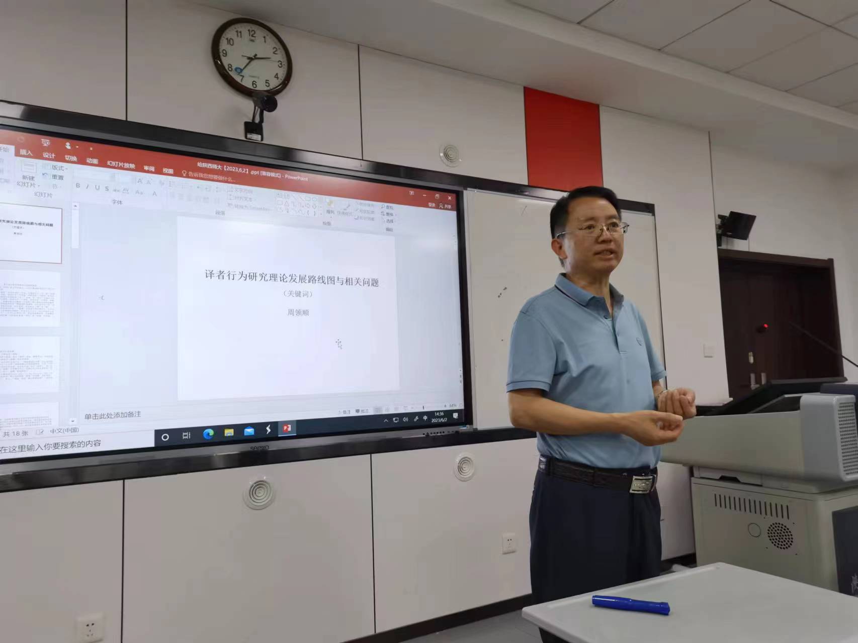 周领顺教授表示,译者行为研究的创新基础是其可持续创新的特质。他表示,译者行为研究总的服务于学科、文化和国家战略需求,强调科研工作和人才培养中的创新意识和元素,目标在于更新学术思维,提升科研创新力。基于该理论系统,周教授深入浅出分析了许渊冲、葛浩文和钱钟书三大翻译家的翻译思想和翻译实践,并指出开展评价的操作性研究是推动实践和理论进步的基石。