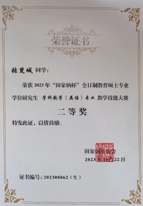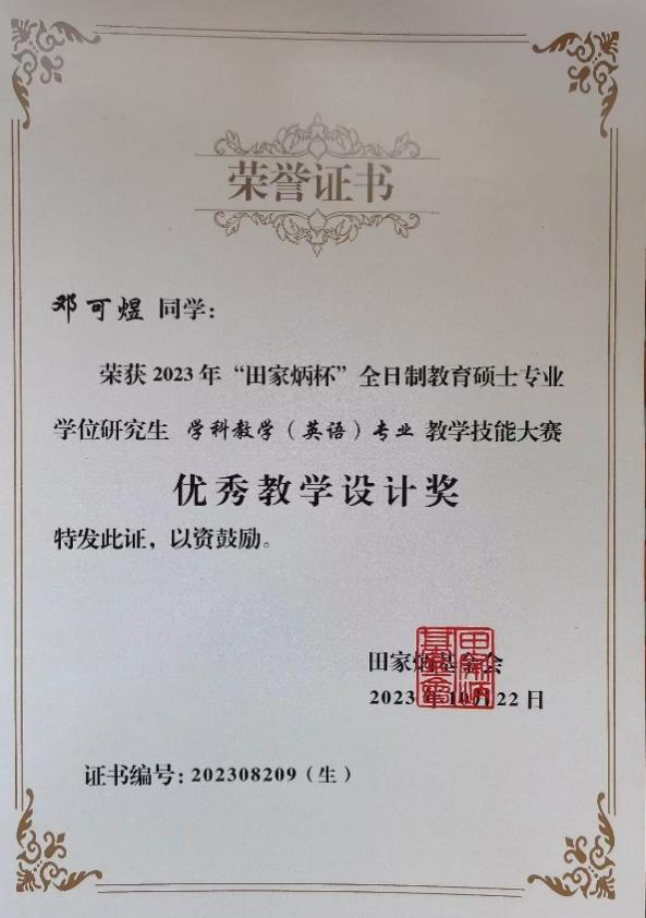 在全国决赛中,面对紧张而激烈的90分钟备课,10分钟讲课和5分钟答辩,两位选手沉着冷静,最终取得圆满成绩。其中,张楚城同学凭借扎实的英语教学基本功,取得全国二等奖。邓可煜同学凭借出色的教学设计,获得优秀教学设计奖。