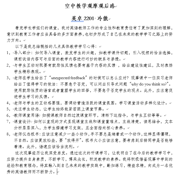 通过空中实习观摩活动,同学们对教育实习有了更加全面和清晰的认识。今后工作中,英语系也将以实习观摩为切入点,总结经验,发现问题,认真反思,为后续的教育实习、见习和研习,以及人才培养质量提升修整出更加切实的方案,提升师范生师德践行能力,教学实践能力,综合育人能力和自主发展能力。