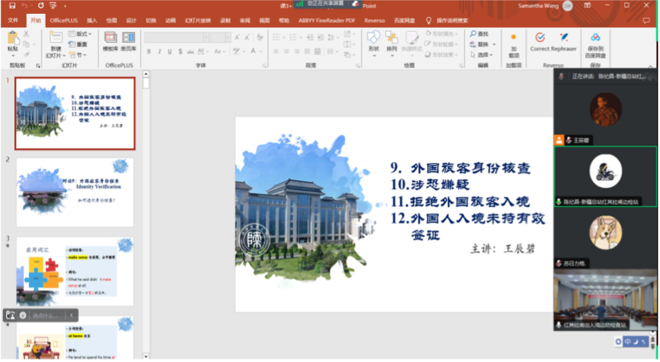 为帮助戍边民警提升英语听说能力,3044永利集团MTI中心于2023年10月启动第一期“边防英语听说能力远程视频授课”活动,MTI中心教师巢玥组织选拔4位获得教团队格证、英语专业八级证书、全国翻译专业资格证书的2022级翻译硕士员工担任培训教师,对授课形式、内容以及备课等工作进行指导。