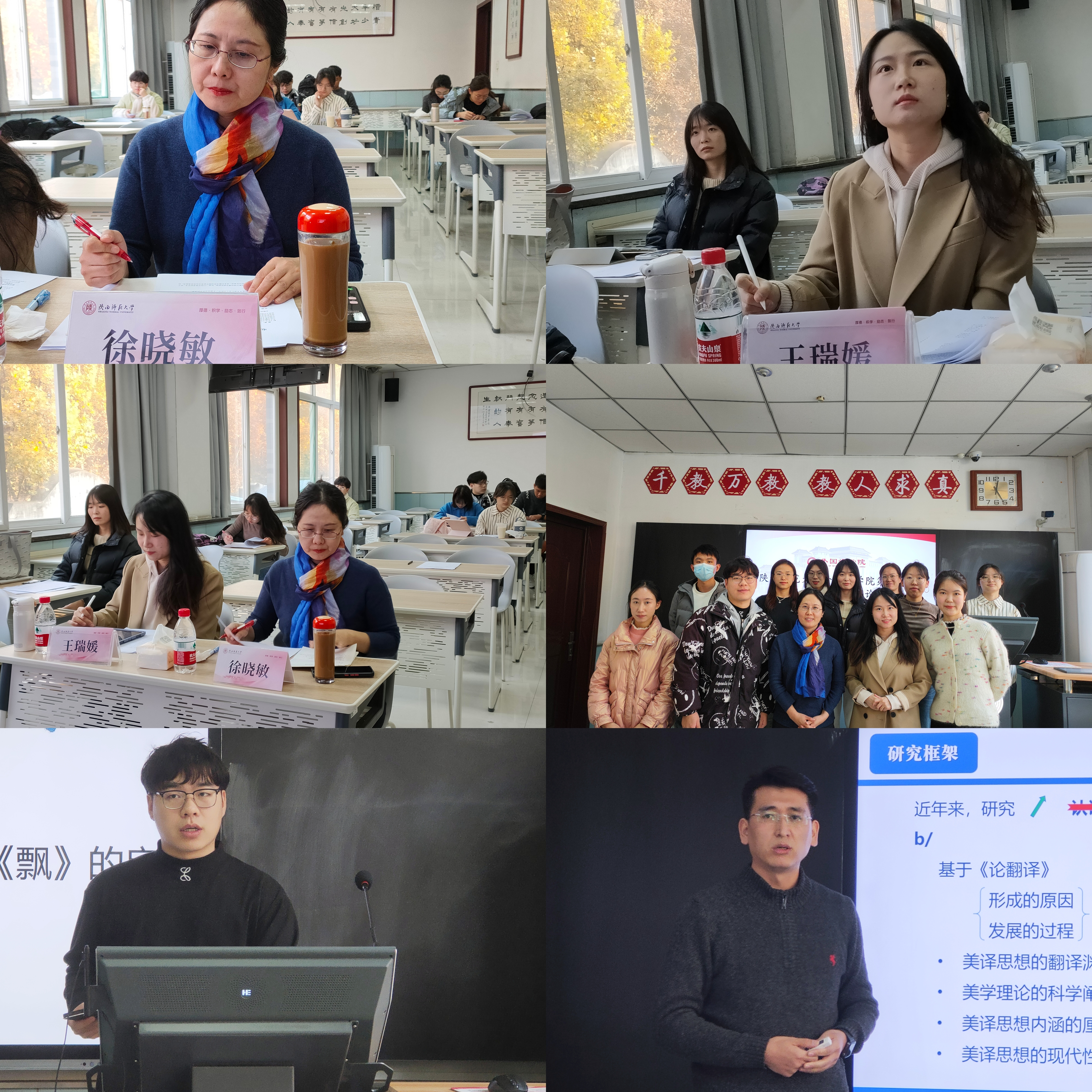 在此次论坛中,八名同学分别从不同方面对不同主题进行了汇报。本科生熊兴梦以“国家形象塑造视域下外宣纪录片中‘文化负载词’的英译探析——以《何以中国》为例”为题进行汇报。硕士生郭佳钰、马和艺、王璐、刘梦靓和董奥分别作了题为“目的论视角下歌曲翻译对比研究——以 The Impossible Dream 为例” “The Analysis of Subtitle Translation from the Perspective of Translation Shifts Theory—Take The Battle at Lake Changjin as An Example” “阐释学翻译理论下《芙蓉》英译本译者主体性研究”“李白诗歌翻译中译者主体性的三维转换分析”“葛浩文小说翻译的前景化语言英译策略研究——以《蛙》英译本为例”的汇报。博士生丁礼明、吕焱莘分别以“林语堂《朱门》中的西安想象”和“《万国公报》译者群体文化身份研究”为题进行了精彩分享。两位评委老师认真倾听,就论文的选题、结构和篇幅安排等方面提出了建议。