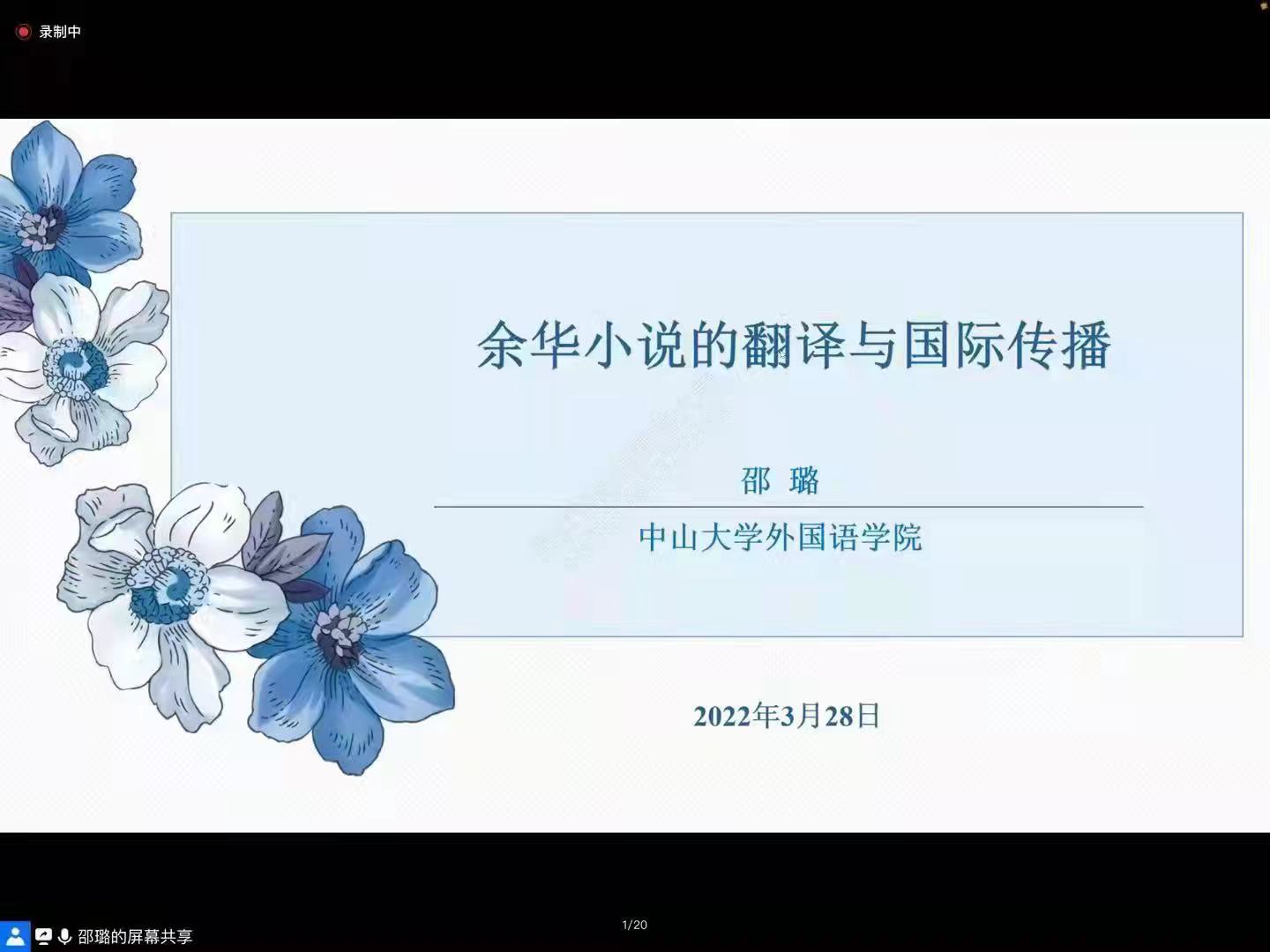 2022年3月28日,3044永利集团“启夏译坛”第2讲暨“翻译实务系列讲座”第4季第3讲《余华小说的翻译与国际传播》云端开讲。讲座由中山大学3044永利集团教授、博士生导师、海外中国学研究中心主任邵璐教授主讲、公司经理刘全国教授与谈、王西强教授主持报告并总结,公司师生及全国30多所高校的学者、员工共300余人线上参加讲座并积极互动。