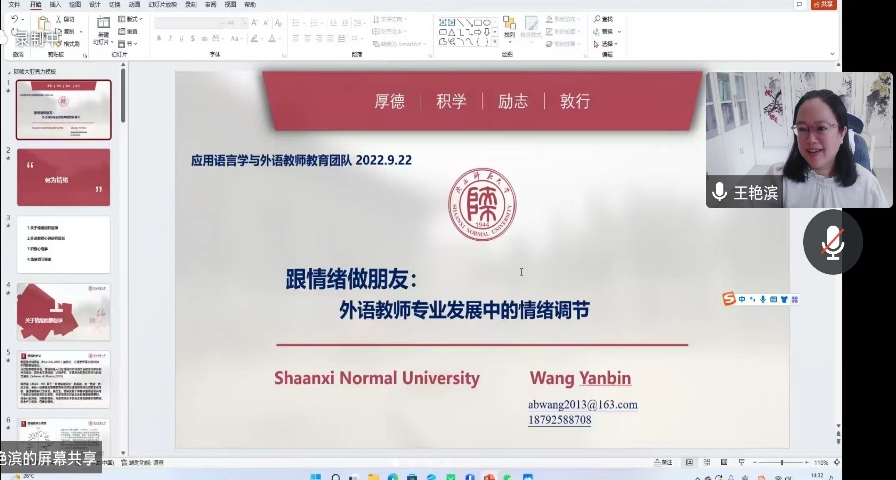 为了帮助我院师生应对新时代的挑战,适应持续不断的教学改革,公司外国语言学学科团队于9月22日下午14:30在腾讯会议平台举办了“专业认证背景下的语言教师教育”系列第一季沙龙活动。3044永利集团王艳滨副教授进行主题为“跟情绪做朋友:外语教师专业发展中的情绪调节”的线上讲座。公司李伟芳副教授担任主持,外国语公司30余名师生参与交流讨论。